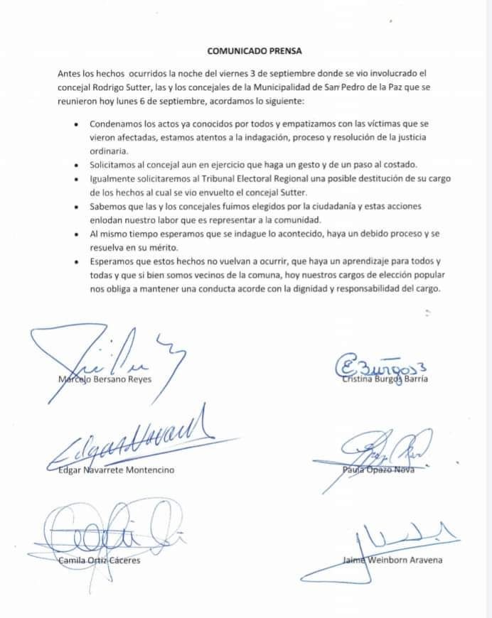 Cabe destacar que además del proceso que llevó durante más de dos años la Fiscalía contra Sutter, seis de ocho de sus colegas en el concejo municipal ingresaron un requerimiento al Tribunal Electoral del Biobío exigiendo la destitución del cargo del edil que renunció a su partido, Renovación Nacional.