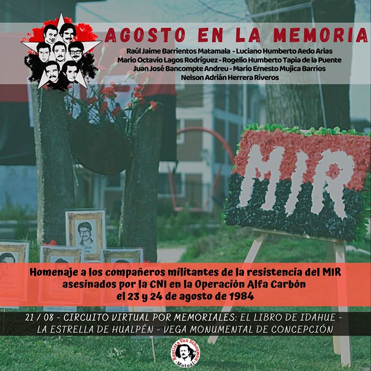 En Concepción, este viernes 21 de agosto, integrantes de la Corporación Mutual Bautista Van Schouwen, realizaron una “ruta de la memoria” en que se rindió homenaje a los tres militantes miristas ejecutados en la provincia en aquellos sucesos. El recorrido se hizo por los sitios en donde existen memoriales que se han levantado en memoria de los caídos; en el camino a Santa Juana, sector Idahue, en el lugar en que la CNI ejecutó a Nelson Herrera Riveros; en Hualpén, en el sector de Avda. Grecia con Nápoles, en donde asesinaron a Luciano Aedo Arias, y en la Vega Monumental, en Avda. 21 de Mayo con Mencía de los Nidos, en donde fue asesinado Mario Lagos Rodríguez. En cada uno de estos sitios se rindió tributo y depositaron ofrendas florales de homenaje.