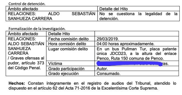 Sanhueza fue detenido a las 6:15 de la mañana por carabineros bajo el cargo del delito "Abuso Sexual Adulto", según consta en acta de detención de la fiscal, Mariana Iturrieta Seguel, siendo trasladado a la 3ra. comisaría de Penco.
