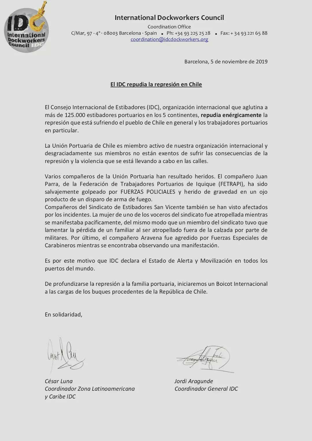 La organización sindical advierte de la posible medida, señalando que la Unión Portuaria de Chile es miembro de la organización internacional, por lo que repudian el accionar represivo contra el pueblo chileno en general y contra los portuarios en particular.