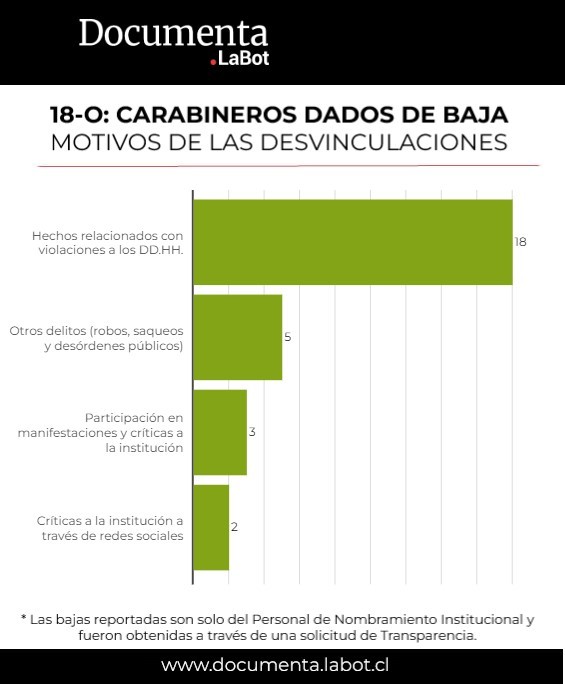 Para ver información en mayor profundidad, revisa el reportaje de LaBot: A tres años del 18-O: Al menos 28 carabineros han sido dados de baja por hechos vinculados al estallido social
