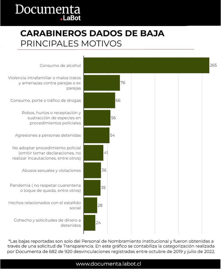 Según información solicitada vía Transparencia por el medio LaBot, las principales causas de las 920 bajas al interior de Carabineros entre 2019 y 2022 serían en primer lugar el consumo de alcohol; luego violencia intrafamiliar o malos tratos y amenazas contra parejas o exparejas; seguidos del consumo o tráfico de drogas; así como robo, hurto receptación. En la lista también figuran abusos sexuales y violaciones; omitir procedimiento; cohecho y solicitud de dinero a detenidos; y la categoría "Hechos relacionados con el Estallido Social", es decir, en su gran mayoría violación a los derechos humanos.