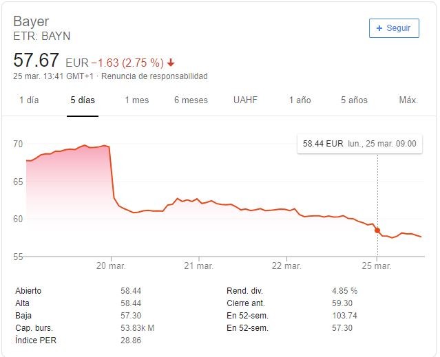 El fallo es una nueva derrota judicial para Monsanto, fabricante del herbicida Roundup, que fue adquirida por la alemana Bayer en junio de 2018 por 63.000 millones de dólares. Tras la noticia, las acciones de la gigante farmacéutica pasaron de 69,59 euros en que había cerrado el día anterior en la Bolsa de Fráncfort donde se cotiza, hasta situarse en 60,83 euros, una caída de alrededor del 9,61% el miércoles 20 de marzo, caída que continuó el jueves 21 y viernes 22. Hoy lunes 25, las acciones de Bayer volvieron a caer, abriendo en 57,74 euros, un verdadero desastre para la compañía.