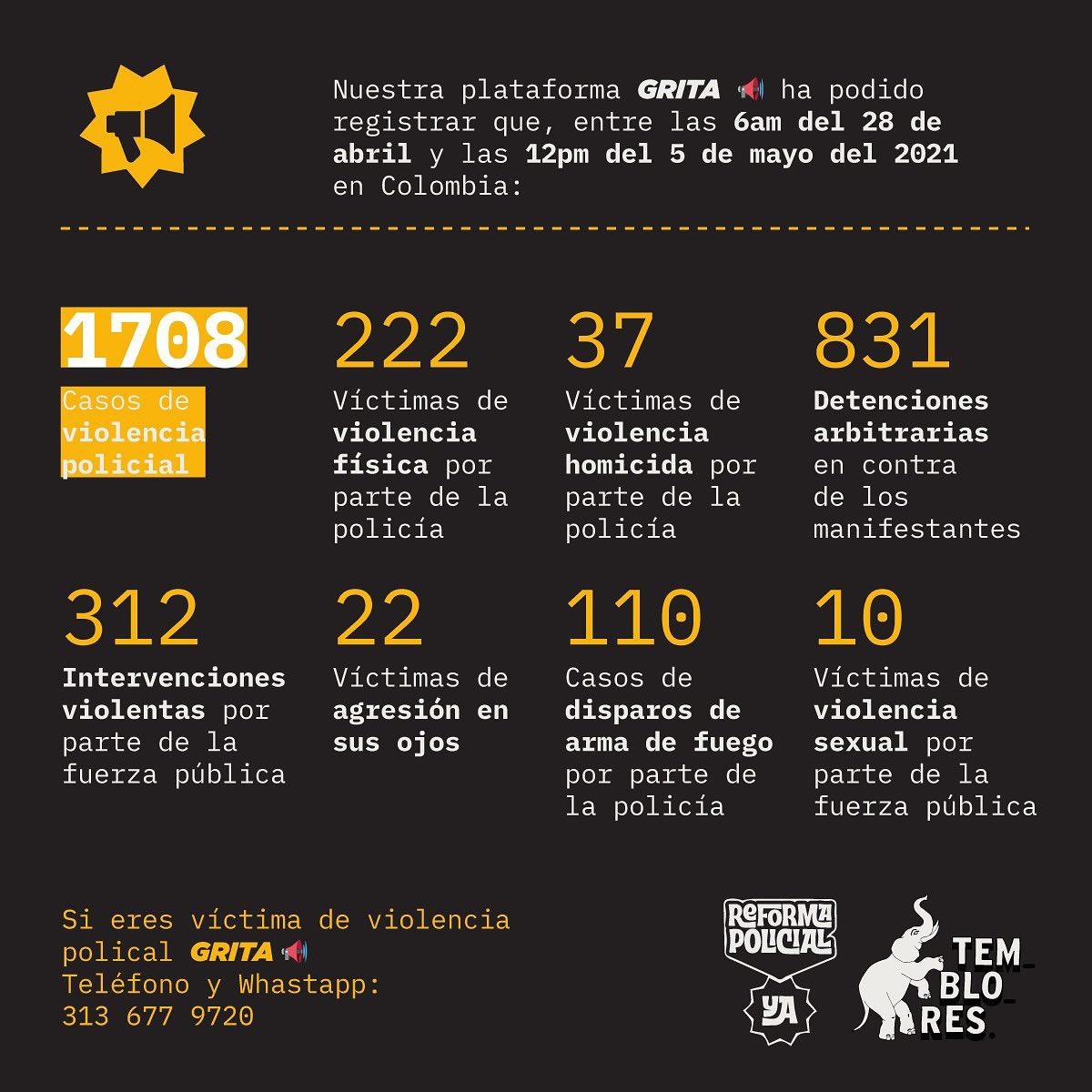 ONG Temblores ha contabilizado 1.708 los casos de violencia policial, donde 222 corresponden a violencia física, 37 asesinatos, 10 casos de violencia sexual, 22 traumas oculares, entre otras.