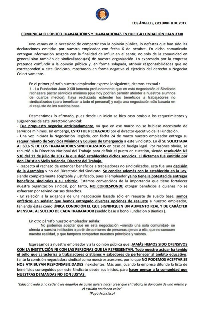 [resumen.cl] Luego de dos semanas de movilización, los trabajadores y trabajadoras de los establecimientos educacionales de la Fundación Educativa Juan XXIII, de la provincia del Biobío, demandan la intervención de la iglesia y que se les reconozca su labor en el prestigio de los colegios y escuelas, mientras los directivos de la Fundación indicaron que lo presentado sería su última oferta.