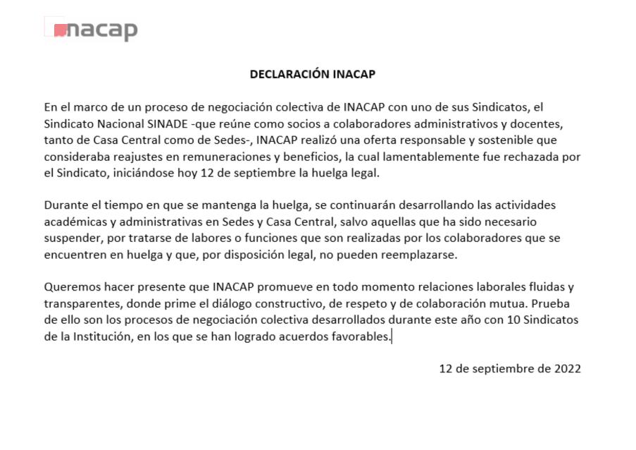 Tras la publicación de esta nota, basada en la conversación con la dirigenta Sara Cartagena, desde INACAP nos hicieron llegar el siguiente comunicado: