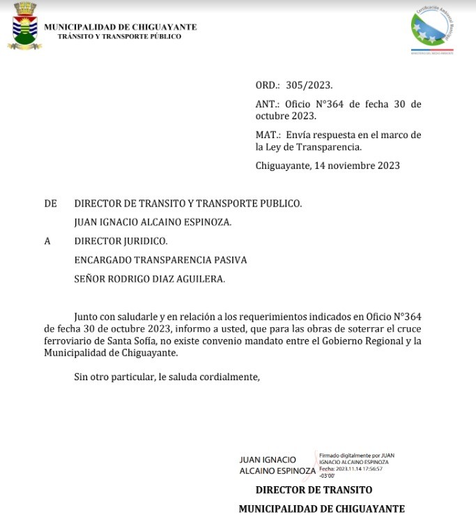 En su respuesta, el director de Tránsito y Transporte Público señala que "para las obras de soterrar el cruce ferroviario de Santa Sofía, no existe convenio mandato entre el Gobierno Regional y la Municipalidad de Chiguayante".