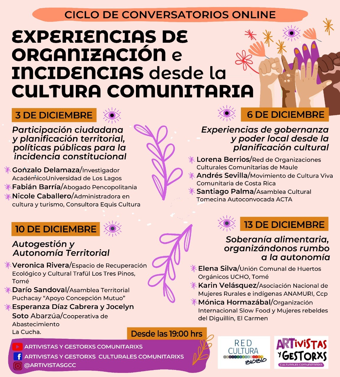 En este contexto, la plataforma de Artivistas y Gestorxs Culturales Comunitarixs ha levantado un ciclo de conversaciones sobre "experiencias de organización e incidencias desde la cultura comunitaria", espacio que busca ser un punto de encuentro para compartir el conocimiento respecto a, entre otras cosas, los modelos de gestión de soberanía y gobernanza local.