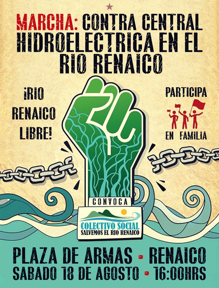 En la comuna de Renaico -provincia de Malleco- el próximo sábado 18 de agosto a las 16:00 horas en la Plaza de Armas, el Colectivo social salvemos el río Renaico ha convocado a una manifestación contra la aprobación de la Central Hidroeléctrica de Pasada Agua Viva que utilizará el caudal del río Renaico y que se instalará en el sector Villa Amargo, perteneciente a la Comuna de Collipulli.