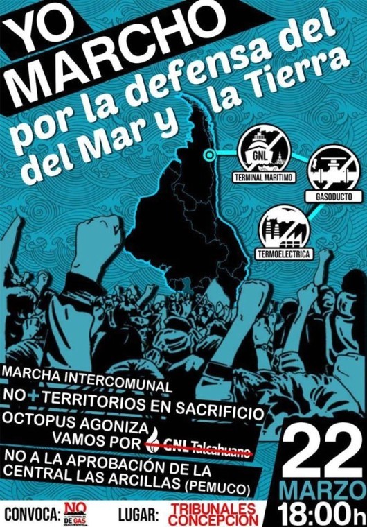 Carolina Arriagada de la agrupación socioambiental Coordinadora Chorera de Talcahuano y Coordinadora Intercomunal contra los terminales de gas en la Bahía de Concepción anunció que "estamos haciendo un llamado a marchar para este jueves 22 de marzo, a las 18:00 hrs. desde Tribunales de Concepción". Las agrupaciones socioambientales buscan informar acerca de los procesos legales que están llevando adelante contra GNL Talcahuano, proyecto que "está en un momento cúlmine, ya que estamos ad portas de la repuesta que tiene que dar el comité de ministros respecto a la evaluación del proyecto, pensando que ya prontamente tendremos que recurrir al Tribunal ambiental de Valdivia" señaló la vocera.