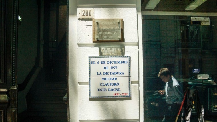 Placa conmemorativa frente al local sindical de los funcionarios judiciales. Además de servir al movimiento sindical, el edificio alberga a la cooperativa de vivienda COVIAFJU 1.