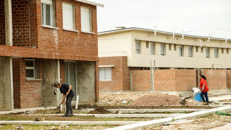 En nuestra visita al barrio Pablo Estramín, tenemos la posibilidad de conversar con algunos socios de la cooperativa Mario Benedetti (Covimabe) que se encuentran cumpliendo con sus horas de trabajo semanal. Aunque la obra gruesa ya culminó, las familias trabajan en los acabados de las viviendas, ya que esperan mudarse al complejo dentro de las semanas siguientes: «Antes no sabíamos qué casa nos iba a tocar, el sorteo se hizo el fin de semana pasado, así que ahora estamos afinando detalles», cuenta una compañera. En las cooperativas de FUCVAM, la asignación de vivienda se realiza según el tamaño del núcleo familiar. Por lo tanto, aunque las/os cooperativistas saben de antemano qué tamaño tendrá su vivienda, desconocen cuál casa dentro del predio será la suya, ya que éstas se sortean al término de la construcción. Este modelo promueve el compromiso con la totalidad del conjunto habitacional, así como el trabajo en equipo, tal como pudimos constatar en nuestra visita. Asimismo, con la ayuda mutua, las/os cooperativistas logran cubrir el 15% del costo con recursos propios, monto requerido para complementar el 85% de préstamo otorgado por el gobierno central para la construcción de las viviendas. Pero para la FUCVAM, la ayuda mutua es una noción mucho más abarcadora, que trasciende la mera mano de obra. Así lo aclara Fernando Zerboni: