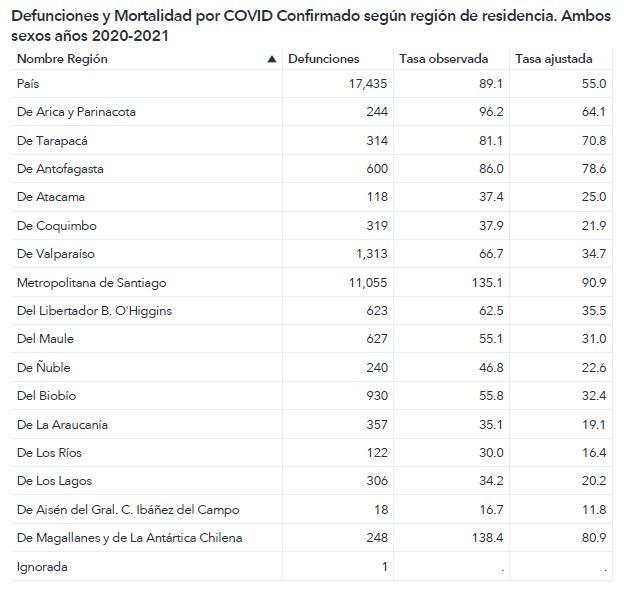 La cantidad muertes considerando casos confirmados alcanzó las 16.814 en 2020 más 621 personas este 2021 sumando 17.435. La región del Biobío registró 824 muertes en 2020 y 106 muertes en 2021 alcanzando un total de 930