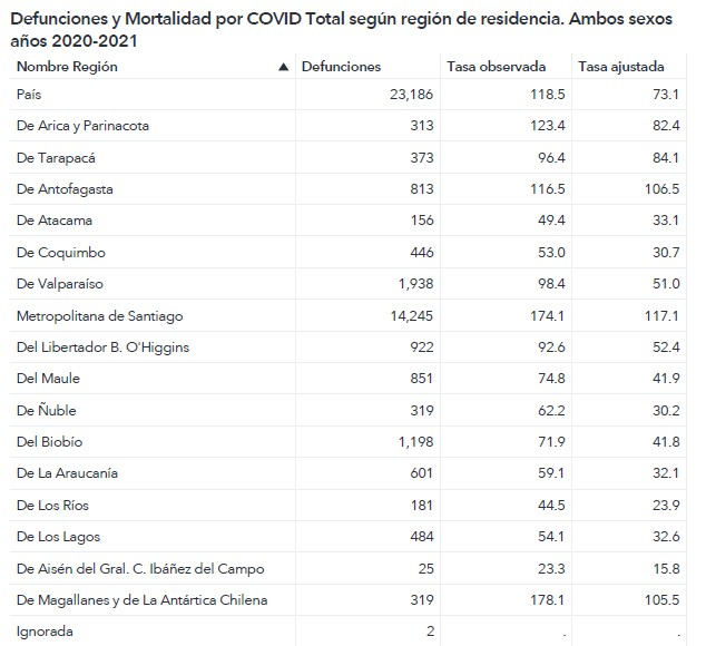 La cifra total de personas fallecidas (22.264 en 2020 y 922 en 2021) alcanzó las 23 186 personas. En la región del Biobío el número de defunciones totales alcanzó las 1.053 en 2020 y las 145 este 2021 para alcanzar un total de 1.198