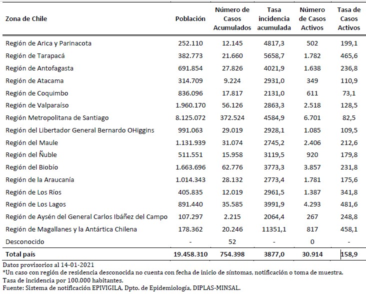 La siguiente tabla muestra el número de casos y tasa de incidencia de casos COVID-19 según región de residencia en Chile, con fecha al 14 de enero de 2020.