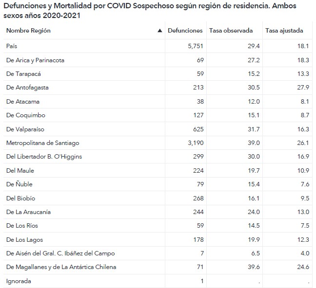 Mientras que la cifra de fallecimientos sospechosos de Covid-19 el año 2020 alcanzó las 5.450 más 301 personas este 2021 alcanzando 5.751. El Biobío presentó 229 muertes en 2020 y 93 muertes sospechosas para alcanzar un total de 268 personas.