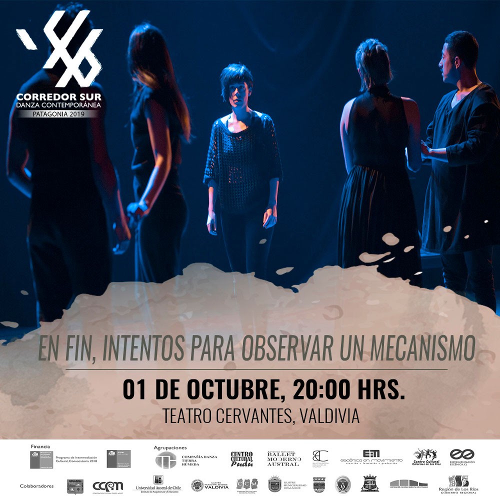 Luego, en el mes de octubre Corredor Sur se hace presente nuevamente en el festival con la obra “En Fin, Intentos para Observar un Mecanismo” de la creadora Patricia Campos y el Centro de Experimentación Escénica de Valdivia. La función será el martes 01 de octubre a las 20:00 horas en el Teatro Cervantes.