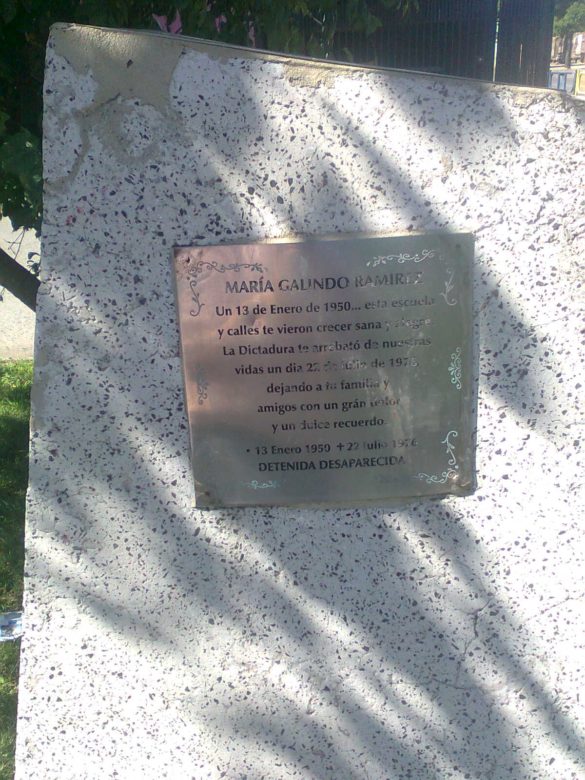 En la ciudad de Coronel la luchadora social es recordada de distintas maneras y de forma permanente. En la Población Villa Mora, un monolito rescata su memoria así como la de otros tres vecinos de la población caídos durante la dictadura. En la Población Juan Valenzuela, una calle lleva el nombre de María Galindo. Del mismo modo, el nombre de María también forma parte del Memorial por los Derechos Humanos que existe en la Plaza de la ciudad en homenaje a los caídos originarios de la comuna.