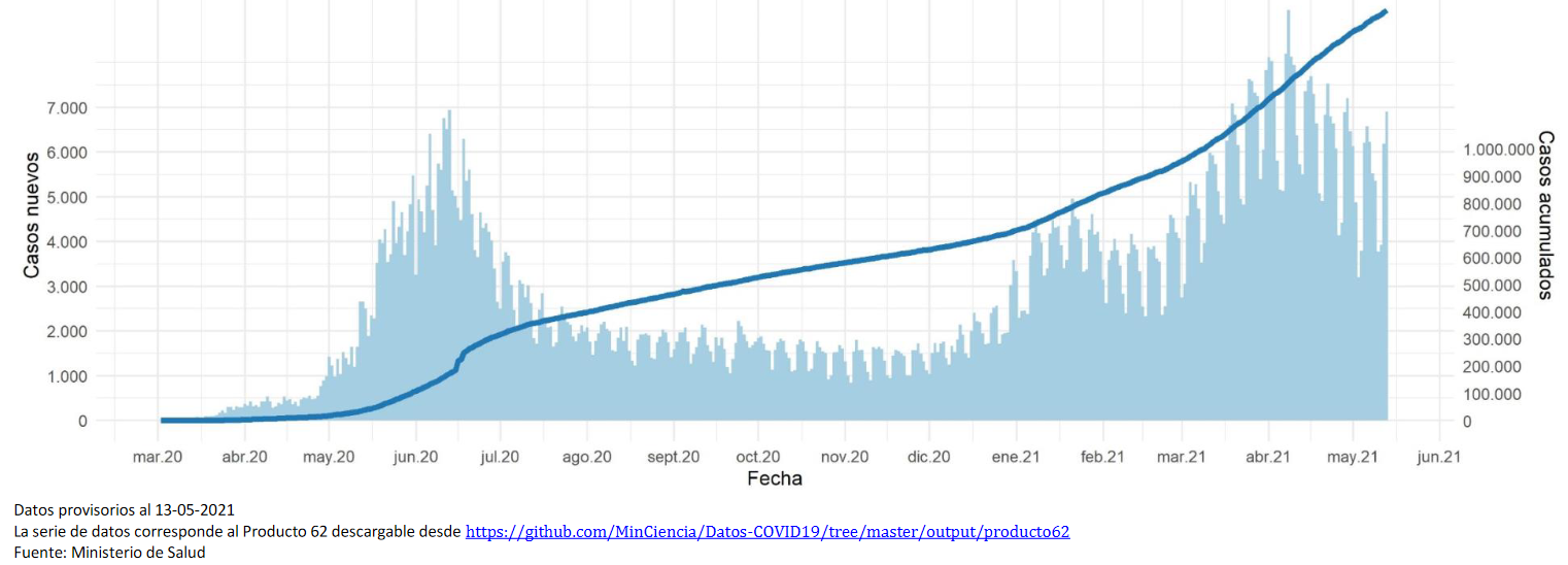 Casos nuevos COVID-19 (barras) y casos acumulados (línea azul) entre marzo de 2020 y abril de 2021 en Chile