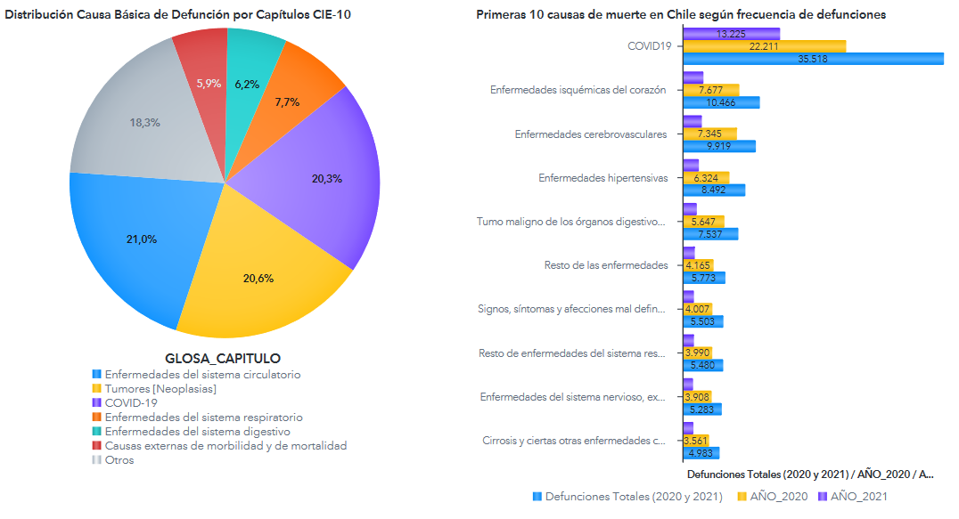 A continuación la gráfica muestra las principales causas de muerte en Chile en 2020 y 2021, donde la COVID-19 ocupa el primer lugar.