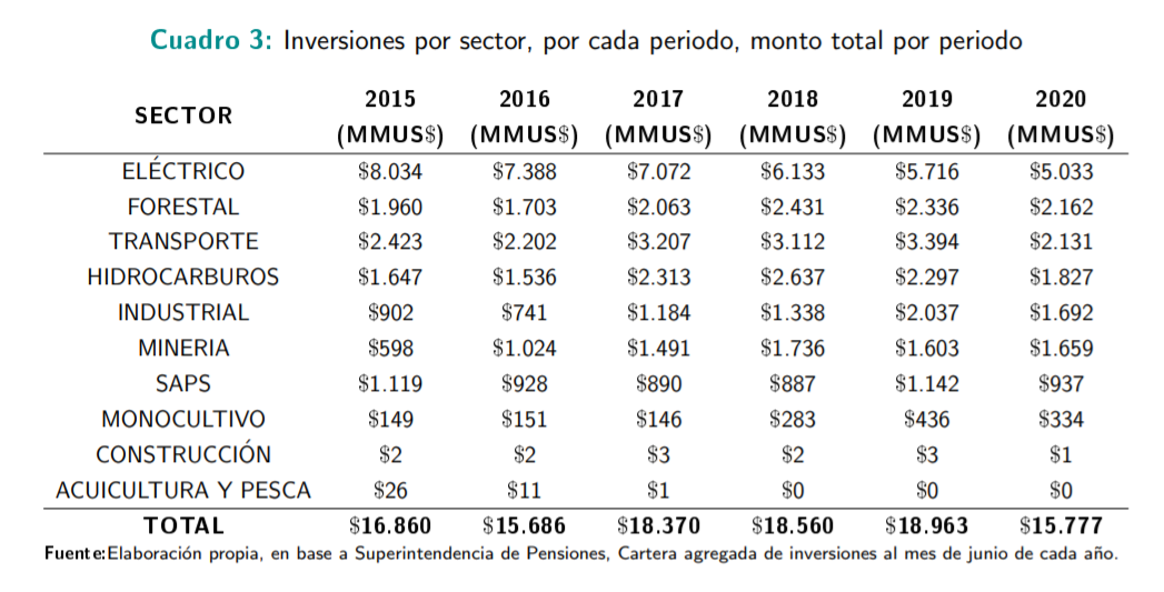 Cuadro de inversión en el sistema de AFP por sector | Fuente: Fundación Sol. (2020). Inversiones de las AFP en empresas extractivistas y de alto impacto ambiental. p. 29.