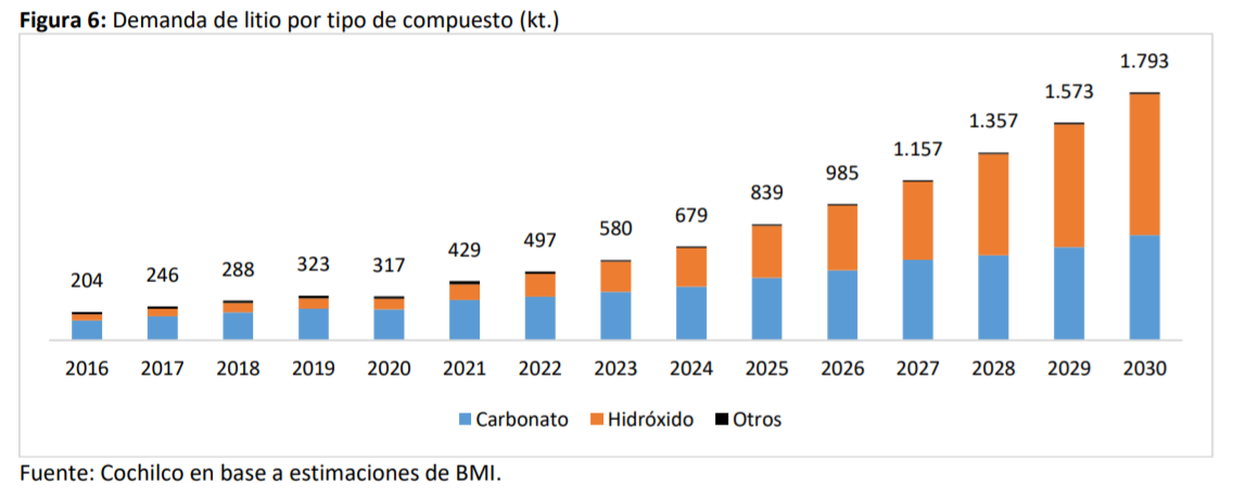 Proyección demanda de litio | Fuente: Cochilco. (s/f). Oferta y demanda del litio hacia el 2030, p. 11.