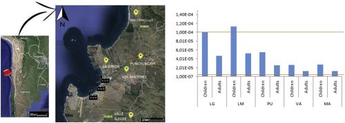 El arsénico fue el factor dominante alcanzando un inaceptable riesgo carcinógeno, es decir, potencialmente capaz de producir cáncer al exponerse a tejidos vivos. Este riesgo es considerado inaceptable para los niños en dos de las locaciones de muestreo más cercanas al complejo industrial, mientras tanto en el resto de los sitios de muestreo en el área de estudio el riesgo fue considerado como justo en el rango tolerable para niños y adultos (ver Figura 6).