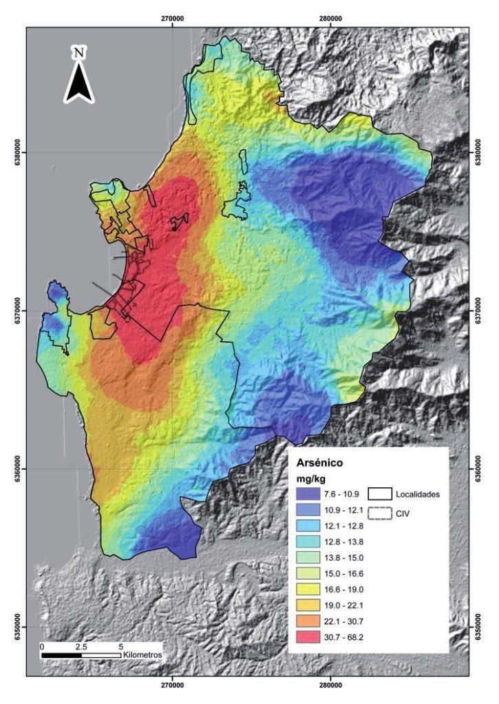 El estudio concluyó que las concentraciones de arsénico (As) indican un impacto por la actividad del Complejo Industrial Ventanas (CIV) en suelos de la comuna de Puchuncaví y Quintero. Tal como se observa en la Figura 1, las mayores concentraciones de arsénico se encuentran en torno al CIV, en concordancia con estudios previos. El estudio concluyó que una amplia extensión de la zona estudiada se encuentra por sobre la norma canadiense. Los investigadores recalcaron que las concentraciones están por sobre el fondo geoquímico y no son naturales, estando asociadas a la fundición de cobre de Ventanas.on que las concentraciones están por sobre el fondo geoquímico y no son naturales, estando asociadas a la fundición de cobre de Ventanas.on que las concentraciones están por sobre el fondo geoquímico y no son naturales, estando asociadas a la fundición de cobre de Ventanas.on que las concentraciones están por sobre el fondo geoquímico y no son naturales, estando asociadas a la fundición de cobre de Ventanas.