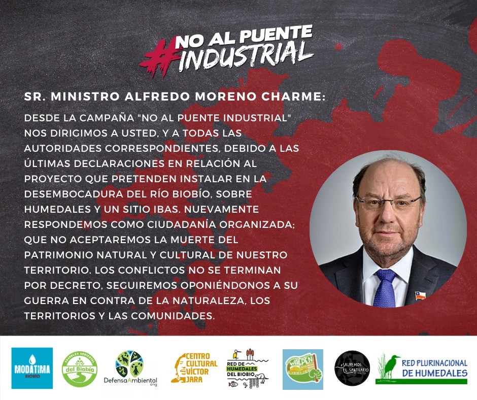 Desde la campaña "No al Puente Industrial" nos dirigimos a usted, y a todas las autoridades correspondientes, a raíz de las últimas declaraciones en relación al proyecto que pretenden instalar en la desembocadura del río Biobío, sobre #Humedales y un Sitio #IBAs: