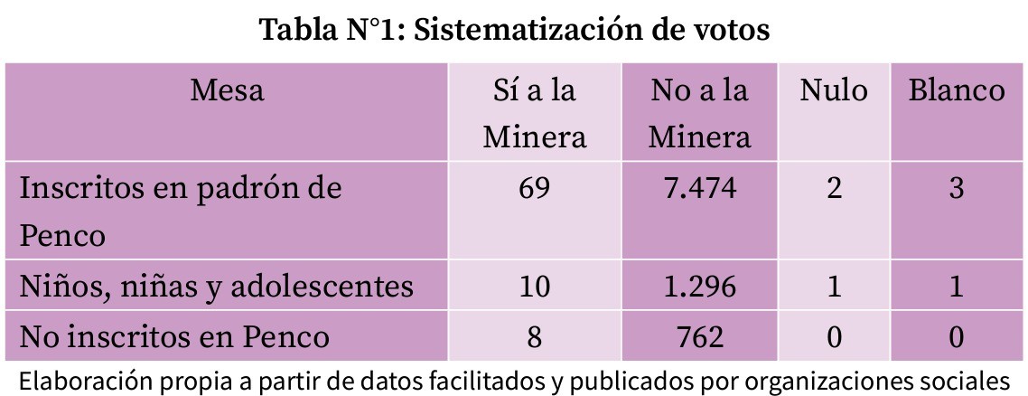 “Fue una herramienta que no se esperaba el impacto que iba a tener, porque al ser inédita, los resultados fueron inéditos y tuvo un impacto que trascendió lo comunal y lo regional. Ya no era Penco no quiere mineras con banderas, sino que era Penco no quiere minera, va y vota y deja un registro de esto, de que esto nos duele, esto no puede ser, nos está pasando a llevar, nos molesta, es nuestro buen vivir. Nos va a cambiar mucho la vida, la salud y los sentires si viniera un proyecto extractivista a una comunidad que es tan tranquila, que trata de alejarse de los ritmos de ciudad”[18].