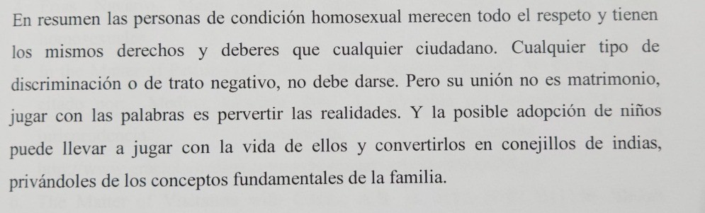 A modo de ejemplo, entre sus conclusiones el texto plantea que "la adopción de menores, por parte de parejas homosexuales, o por parte de un individuo homosexual (gay o lesbiana) en solitario, no es la mejor opción para el sano desarrollo y crecimiento del menor". En el mismo párrafo, la tesis estipula que esto no respondería a discriminación, "sino más bien una preocupación por los menores que se encuentran en esta situación, o que podrían encontrarse en un futuro próximo en esta situación".