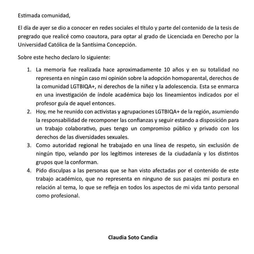 Asimismo, además de hacer referencia a trabajos vinculados a líneas de respeto y sin exclusión, sumado al asumir "la responsabilidad de recomponer las confianzas", Claudia Soto cerró pidiendo "disculpas a las personas que se han visto afectadas por el contenido de este trabajo académico, que no representa en ninguno de sus pasajes mi postura en relación al tema".
