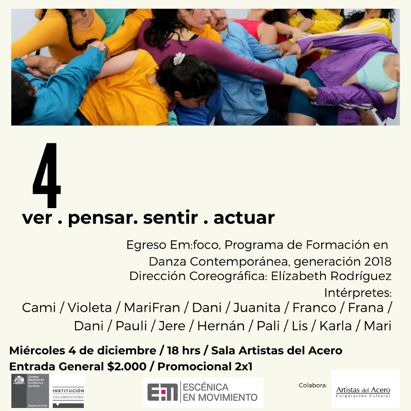 “4/ver. pensar. sentir. actuar” tendrá su estreno este 4 de diciembre, a las 18:00, en la sala de espectáculos de Artistas del Acero. La entrada tiene un costo general de $2.000 pesos, con posibilidad de activar un 2x1 en boletería. La obra de danza es para todo público. Si deseas conocer algo más del proceso creativo y el estreno, puedes ingresar a las plataformas digitales del Programa EM:FOCO y de Escénica en Movimiento.