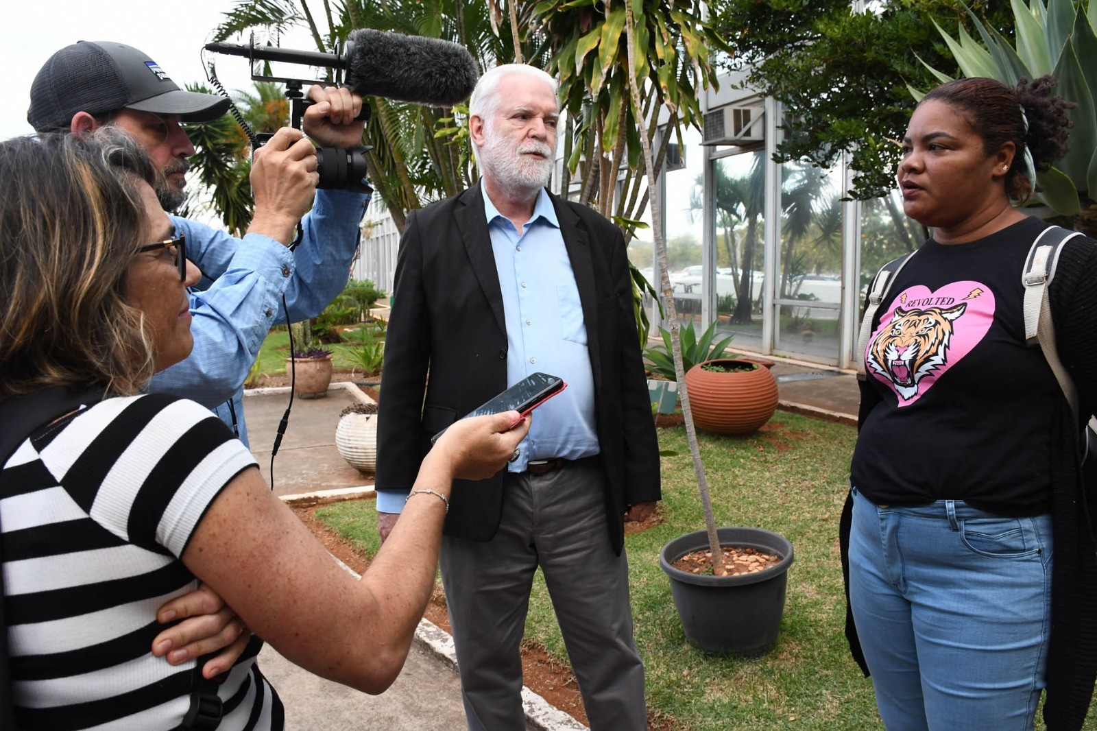 David Hathaway en la actualidad. En la imagen se le puede apreciar traduciendo al ingles el relato de una persona afectada por plantaciones de monocultivo de eucalipto en Brasil durante una gira internacional contra los árboles transgénicos. Creditos de la imagen: Orin Langelle (https://www.langellephoto.org/)