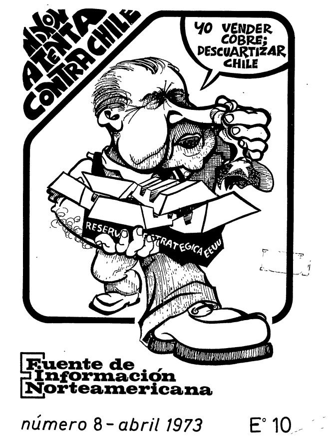 Portada de la revista que publicaba David Hathaway con un grupo de compañeros y compañeras norteamericanas en Chile durante la Unidad Popular. En la imagen una caricatura de Nixon haciendo alusión a su intervención en Chile.