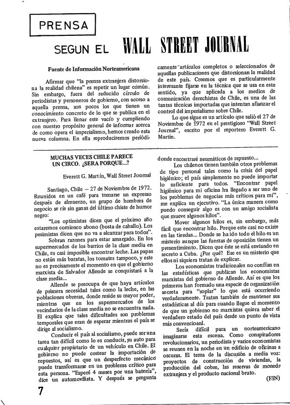 David Hathaway y sus compañeros traducian la prensa norteamericana y la difundían en Chile para que se informara la comunidad, en la imagen una traducción de un articulo sobre Chile en el periódico Wall Street Journal publicado por la Revista FIN antes del Golpe de Estado.