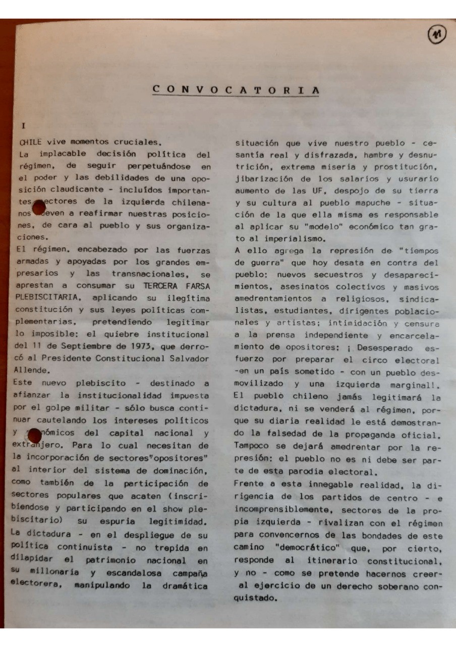Efectivamente, quienes suscribieron el Manifiesto por la Soberanía Popular señalaban en 1988: “Este nuevo Plebiscito –destinado a afianzar la institucionalidad impuesta por el golpe militar- solo busca continuar cautelando los intereses políticos y económicos del capital nacional y extranjero. Para esto necesitan de la incorporación de sectores opositores al interior del sistema de dominación, como también de la participación de sectores populares que acaten (inscribiéndose y participando en el show plebiscitario) su espuria legitimidad”[1].