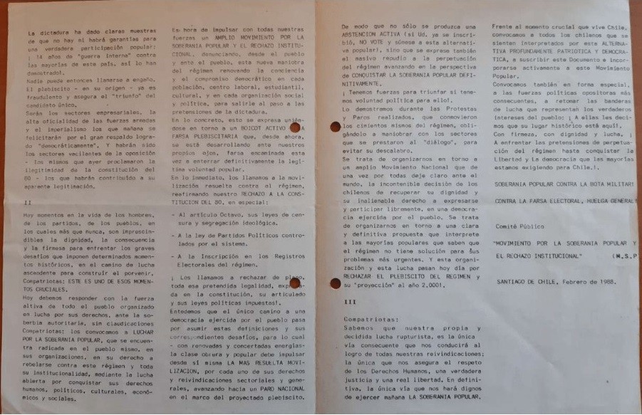 Pero en torno a la coyuntura del 5 de octubre de 1988 no solo se expresó la burguesía y sus aliados. Desde las filas del movimiento popular, y en particular desde el campo de las organizaciones revolucionarias, se agitó el Manifiesto por la Soberanía Popular, documento que en su momento difundió el vocero del Movimiento de Izquierda Revolucionaria (MIR), el sacerdote Rafael Maroto.