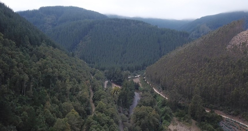 Monocultivo forestal rodeando el río Andalien en Concepción