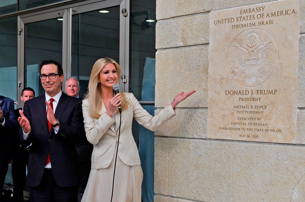 La hija del presidente Trump, Ivanka posa con el secretario del tesoro Steven Mnuchin en la inauguración de la embajada de Estados Unidos en Jerusalén. Créditos: Mahmud Hams, Menahem Kahana/Agence France-Presse — Getty Images. Fuente: New York Times