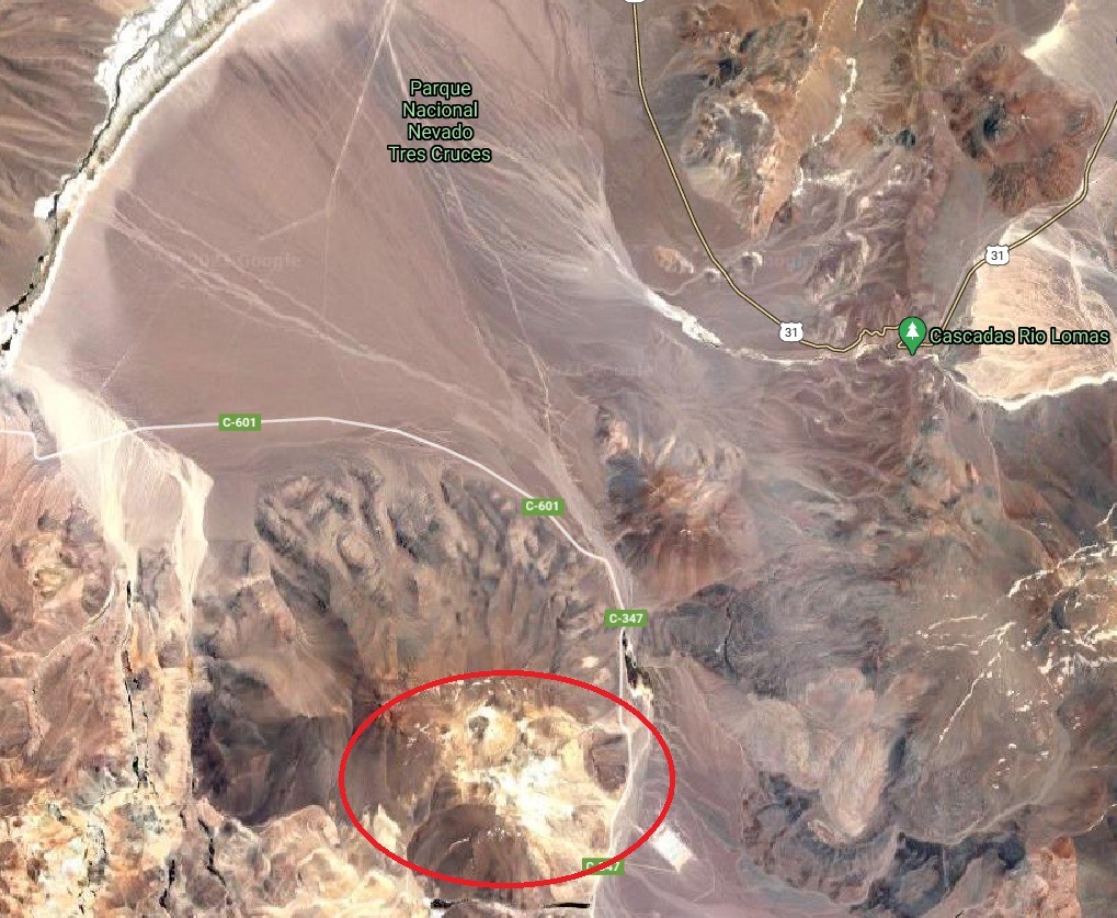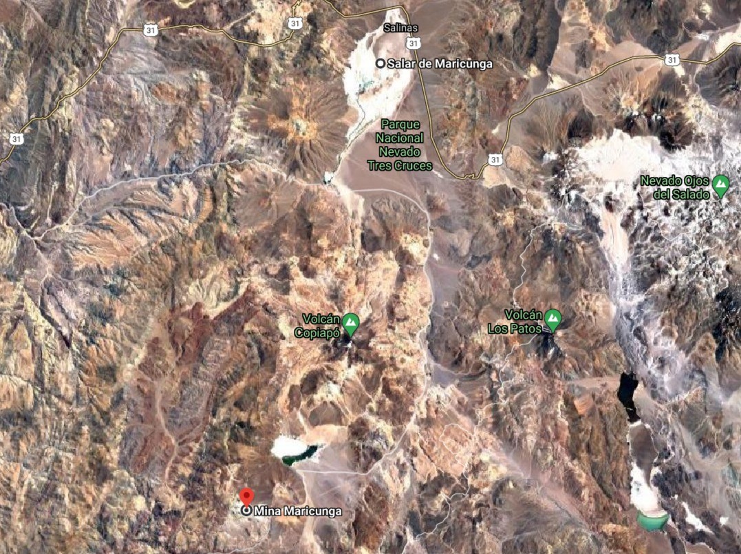 Mapa de referencia: ubicación de los trabajos de Kinross (punto rojo) y el salar de Maricunga (punto blanco) | Fotografía: Google Maps