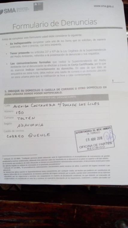 Este lunes, Pedro cursó una denuncia a las oficinas de la Superintendencia de Medio Ambiente (SMA) con sede en Temuco. Anteriormente Pedro ya había cursado denuncias a la Alcaldía de Mar de Queule, la Capitanía de Puerto de Valdivia, ante el Servicio de Salud de Temuco y el Servicio Nacional de Pesca (SERNAPESCA). Estas ultimas instituciones habrían señalado que la empresa estaría operando con permisos vigentes. Sin embargo la Armada le prohibió funcionamiento temporalmente en 2017 y posteriormente la planta volvió a operar.