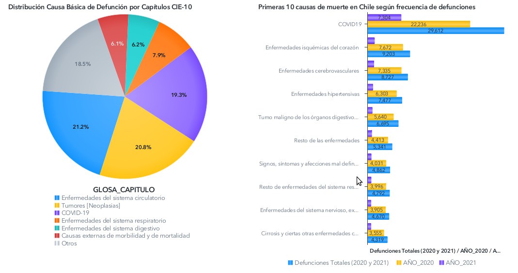 Principales causas de muerte en Chile, años 2020 y 2021. Fuente: Informe Semanal de Defunciones del DEIS