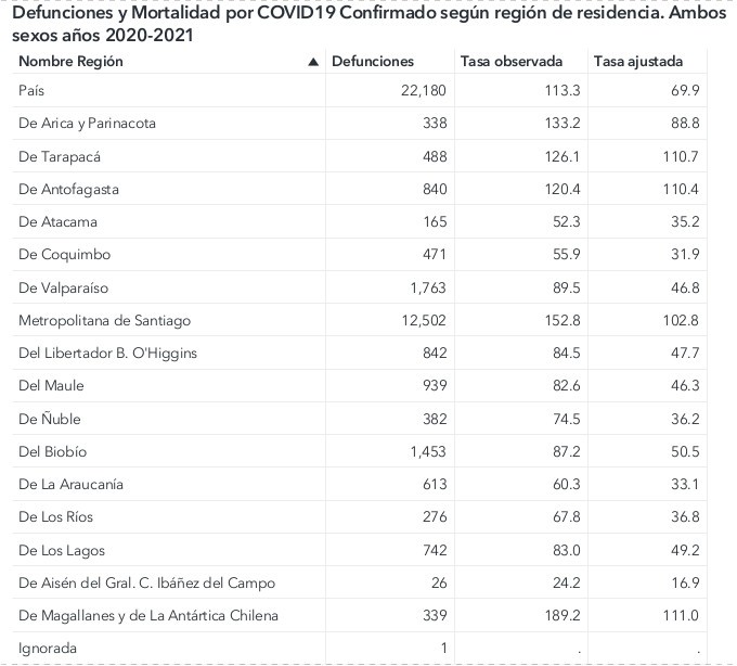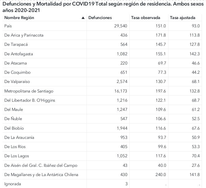 La cifra total de personas fallecidas asociadas alcanzó las 22 236 en 2020 más 7 304 personas este 2021 sumando 29 540. La región del Biobío registró 1 065 muertes totales en 2020 y 879 muertes en 2021 alcanzando un total de 1 944.