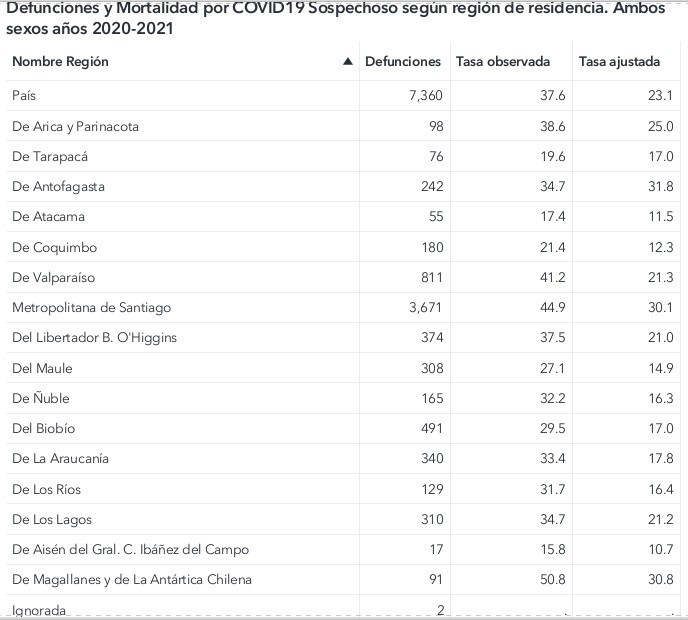 Mientras que la cifra de fallecimientos sospechosos de Covid-19 fueron 5 394 en 2020 más 1.966 personas este 2021 alcanzando 7 630. El Biobío presentó 241 muertes en 2020 y 250 muertes sospechosas en 2021 para alcanzar 491 personas.