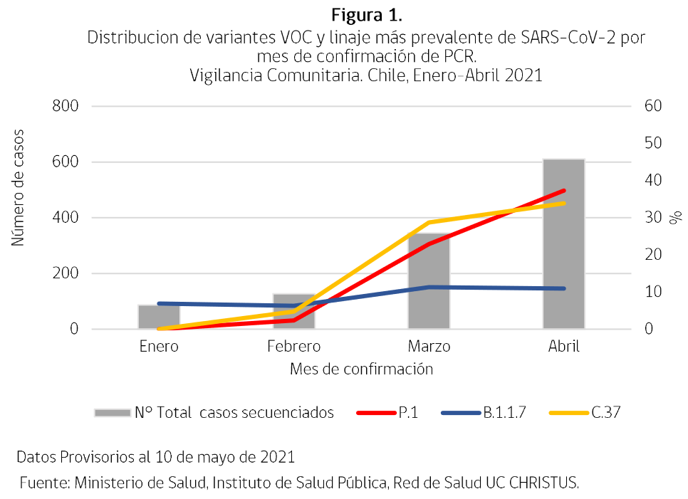 El reporte precisa que "actualmente la variante P.1 es la VOC (variante de preocupación) predominante a nivel nacional desde marzo a la fecha con más de un tercio del total de los casos secuenciados, desplazando a la variante B.1.1.7" a continuación advierten que aunque cuentan con información preliminar, esta variante "muestra un mayor número de hospitalizados y fallecidos en los casos asociados a la variante P.1, respecto a la B.1.1.7, situación que debe ser monitoreada y analizada con precaución dado el menor número de casos de B.1.1.7"