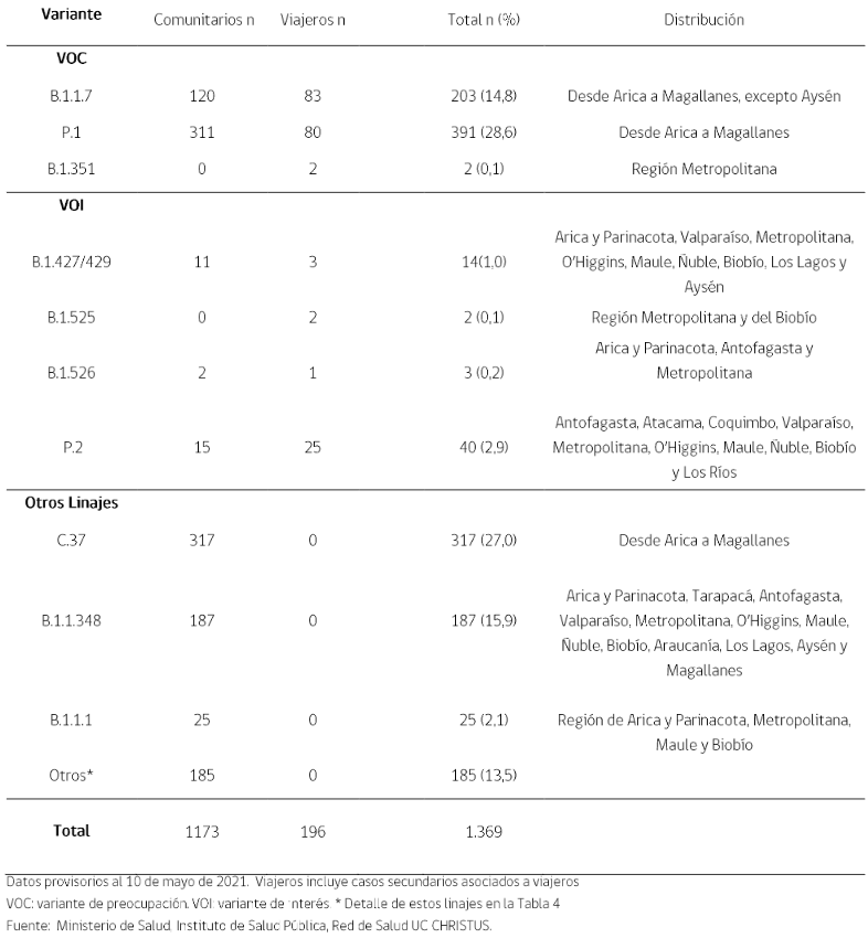 El reporte entrega los resultados del análisis de 1.369 muestras de casos confirmados de SARS-CoV-2 tomadas entre el 22 de diciembre de 2020 y el 10 de mayo de 2021