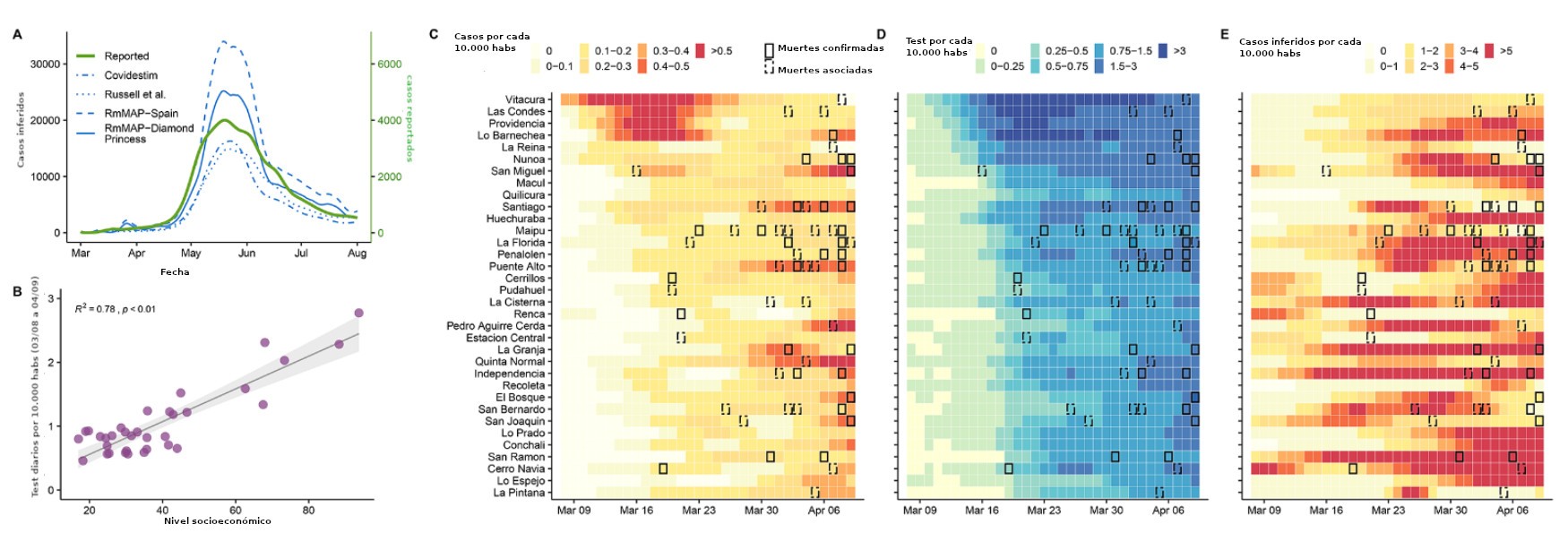 [caption id="attachment_98054" align="alignnone" width="1750"] La figura muestra los casos inferidos y reportados en el área del Gran Santiago. (A) Casos reportados e inferidos en el periodo de estudio. (B) Asociación entre promedio diario de testeo y nivel socioeconómico durante el periodo de alza de casios entre el 3 de agosto y el 9 de septiembre de 2020. (C) Casos reportados por cada 10.000 habitantes durante este periodo. (D) Test por cada 10.000 habitantes en este periodo (E) Casos inferidos obtenidos por el modelo usado en el estudio en este periodo. Gráfica extraída de: G. E. Mena et al., Science10.1126/science.abg5298 (2021). [/caption]