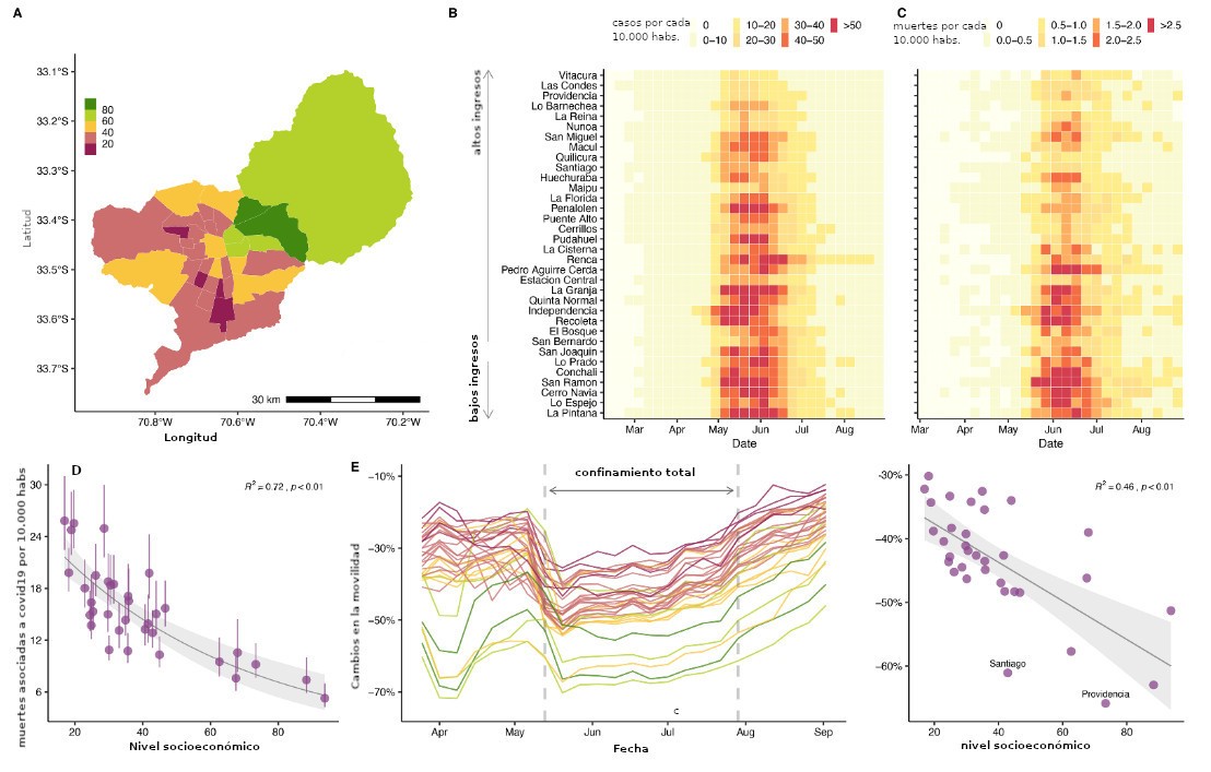[caption id="attachment_98058" align="alignnone" width="1108"] La siguiente figura explica la relación entre el nivel socioeconómico, los casos de COVID-19 y los datos de movilidad en el Gran Santiago. Gráfico (A) Muestras las comunas del Gran Santiago coloreadas de acuerdo a su nivel socioeconómico. (B) Los casos de COVID-19 normalizados por tamaño de población por comuna. Las comunas están ordenadas desde altos ingresos (parte superior) hasta bajos ingresos (parte inferior) (C) Muertes asociadas a COVID-19 normalizadas por tamaño de población por comuna. (D) Tasas de mortalidad asociadas a COVID-19 ajustadas por edad y asociadas con nivel socioeconómico. (E) Reducción diaria en la movilidad por comunas coloreadas según nivel socioeconómico. (F) Reducción en la movilidad promedio durante los confinamientos totales y su asociación con nivel socioeconómico. Gráfica extraída de: G. E. Mena et al., Science10.1126/science.abg5298 (2021).[/caption]