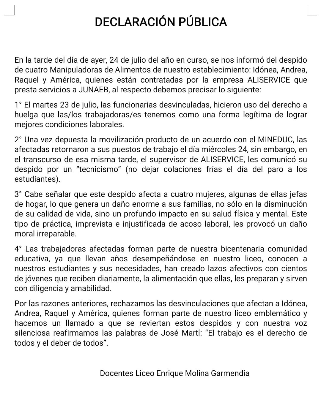 Con protestas al interior del establecimiento, estudiantes del liceo Enrique Molina Garmendia están denunciando la desvinculación de cuatro manipuladoras de alimentos, pertenecientes a la empresa Aliservice. Desde el estudiantado acusan que los despidos serían en represalias por haber protagonizado movilizaciones exigiendo el pago de sus finiquitos, demanda que se extendió a nivel nacional.